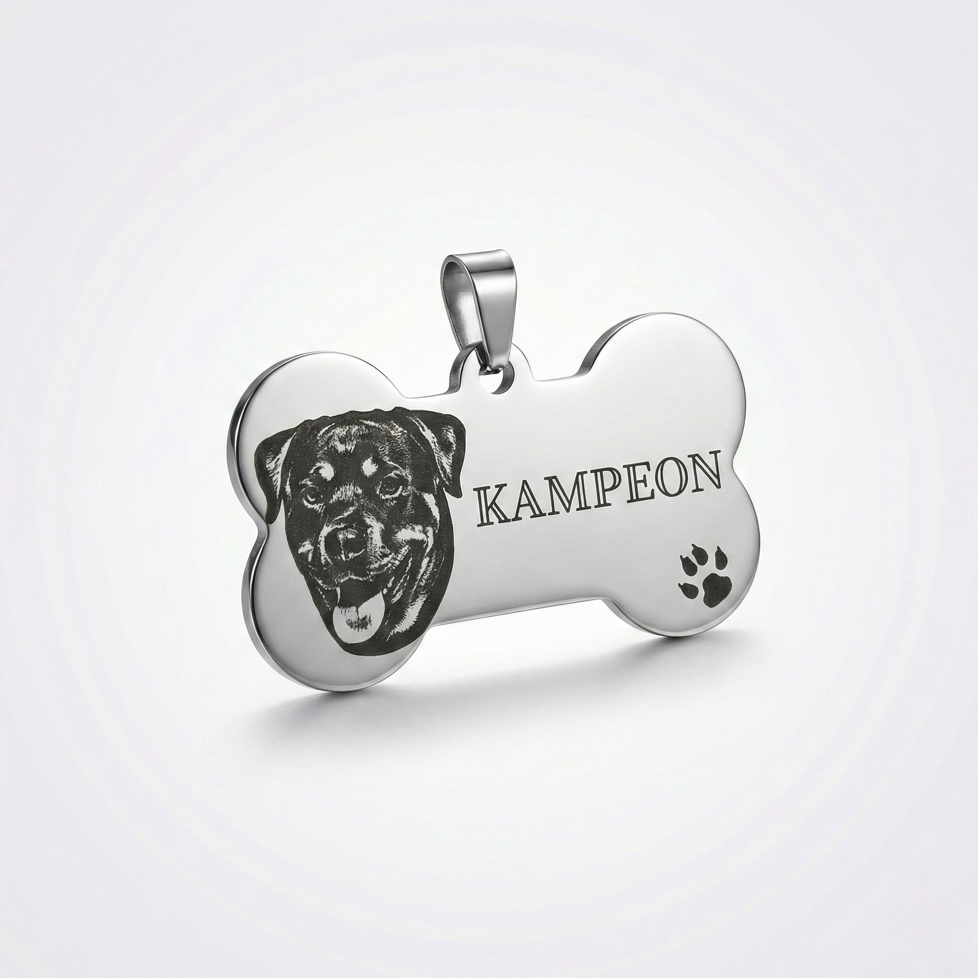 Nuestro modelo en forma de hueso está fabricado en acero inoxidable de alta calidad y es 100% personalizable. Ideal para quienes buscan algo más que una placa común: un accesorio único que acompaña a su mascota todos los días.